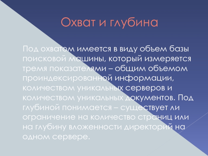 машины, который измеряется тремя показателями – общим объемом проиндексированной информации, количеством уникальных серверов и количеством уникальных документов. Под глубиной понимается – существует ли ограничение на количество страниц или на глубину вложенности директорий на одном сервере.