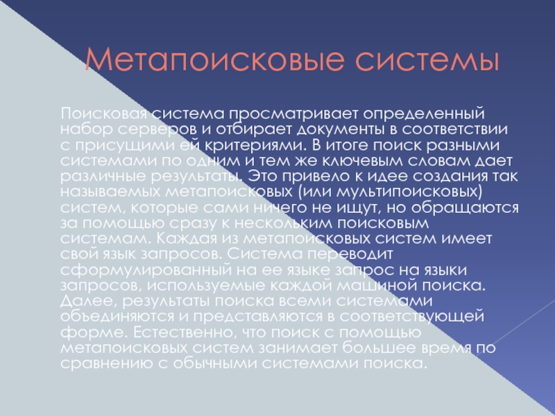 соответствии с присущими ей критериями. В итоге поиск разными системами по одним и тем же ключевым словам дает различные результаты. Это привело к идее создания так называемых метапоисковых (или мультипоисковых) систем, которые сами ничего не ищут, но обращаются за помощью сразу к нескольким поисковым системам. Каждая из метапоисковых систем имеет свой язык запросов. Система переводит сформулированный на ее языке запрос на языки запросов, используемые каждой машиной поиска. Далее, результаты поиска всеми системами объединяются и представляются в соответствующей форме. Естественно, что поиск с помощью метапоисковых систем занимает большее время по сравнению с обычными системами поиска.