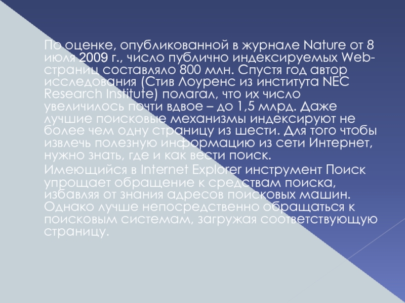 число публично индексируемых Web-страниц составляло 800 млн. Спустя год автор исследования (Стив Лоуренс из института NEC Research Institute) полагал, что их число увеличилось почти вдвое – до 1,5 млрд. Даже лучшие поисковые механизмы индексируют не более чем одну страницу из шести. Для того чтобы извлечь полезную информацию из сети Интернет, нужно знать, где и как вести поиск.