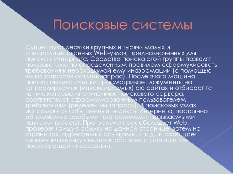 предназначенных для поиска в Интернете. Средства поиска этой группы позволят пользователю по определенным правилам сформулировать требования к необходимой ему информации (с помощью языка запросов создать запрос). После этого машина поиска автоматически просматривает документы на контролируемых (индексируемых) ею сайтах и отбирает те из них, которые, «по мнению» поискового сервера, соответствуют сформулированным пользователем требованиям (релевантны запросу). В поисковых узлах используются собственные индексы Интернета, постоянно обновляемые особыми программами, называемыми пауками (spiders). Программа-паук обследует Web, проверяя каждую ссылку на данной странице, затем на страницах, адресуемых ссылками, и т. д., и сообщает своему владельцу сведения обо всех страницах для последующей индексации.