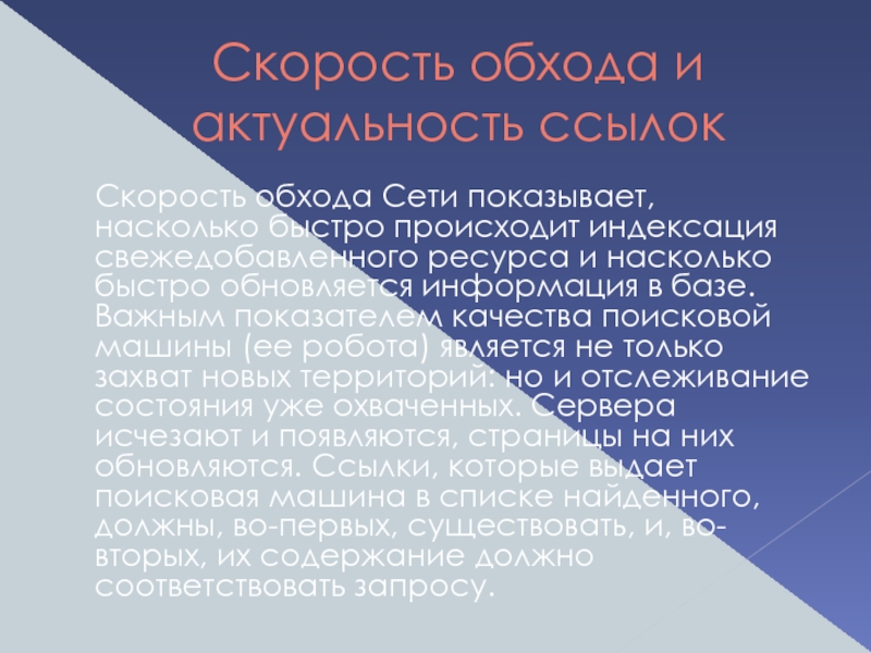 индексация свежедобавленного ресурса и насколько быстро обновляется информация в базе. Важным показателем качества поисковой машины (ее робота) является не только захват новых территорий: но и отслеживание состояния уже охваченных. Сервера исчезают и появляются, страницы на них обновляются. Ссылки, которые выдает поисковая машина в списке найденного, должны, во-первых, существовать, и, во-вторых, их содержание должно соответствовать запросу.