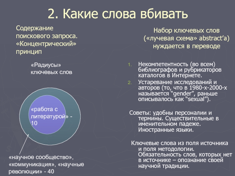 Слайд 7Набор ключевых слов («лучевая схема» abstract’а) нуждается в переводе