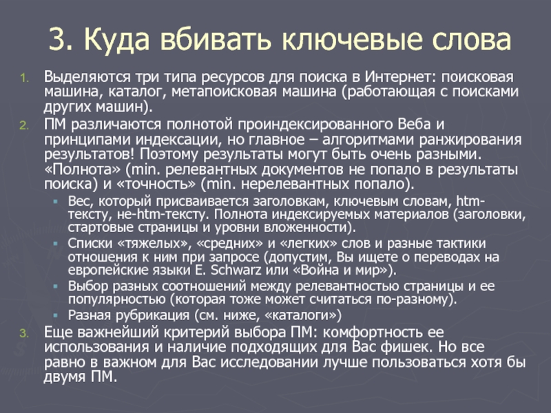 Вес, который присваивается заголовкам, ключевым словам, htm-тексту, не-htm-тексту. Полнота индексируемых материалов (заголовки, стартовые страницы и уровни вложенности).