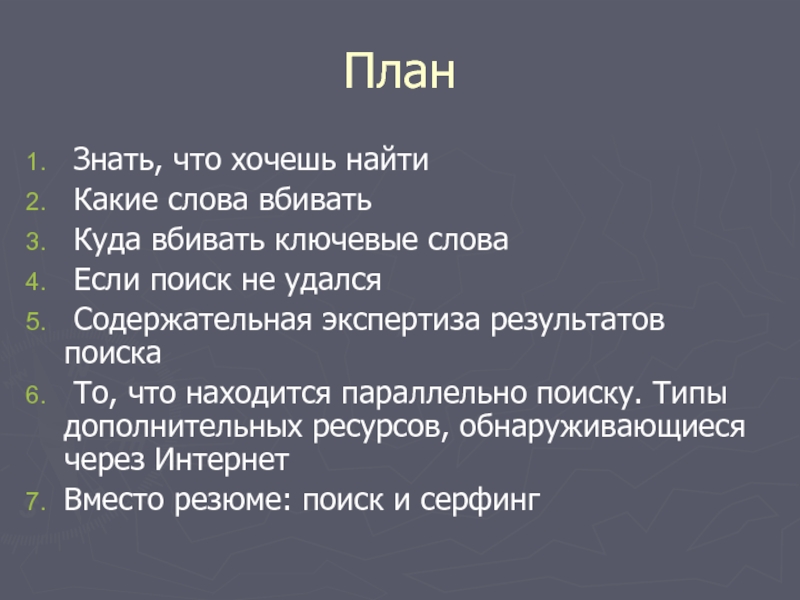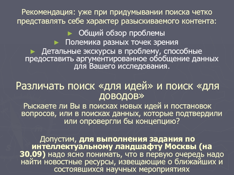 Слайд 5Рекомендация: уже при придумывании поиска четко представлять себе характер разыскиваемого контента: