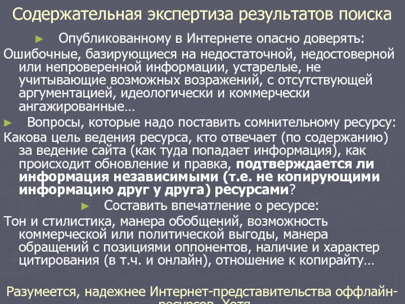 (основное различие с оффлайн-миром) Информация – какая угодно. Непроверенная, ангажированная, случайная, черновая. Способная ввести в заблуждение относительно квалификации или (отсутствия) интересов автора или ресурса. Редко указываются предшествующие источники информации.