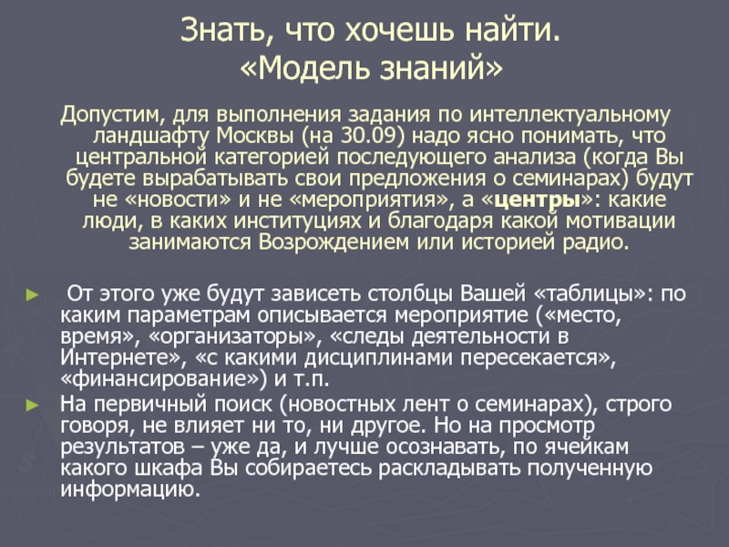 Допустим, для выполнения задания по интеллектуальному ландшафту Москвы (на 30.09) надо ясно понимать, что в первую очередь надо найти новостные ресурсы, извещающие о ближайших и состоявшихся научных мероприятиях