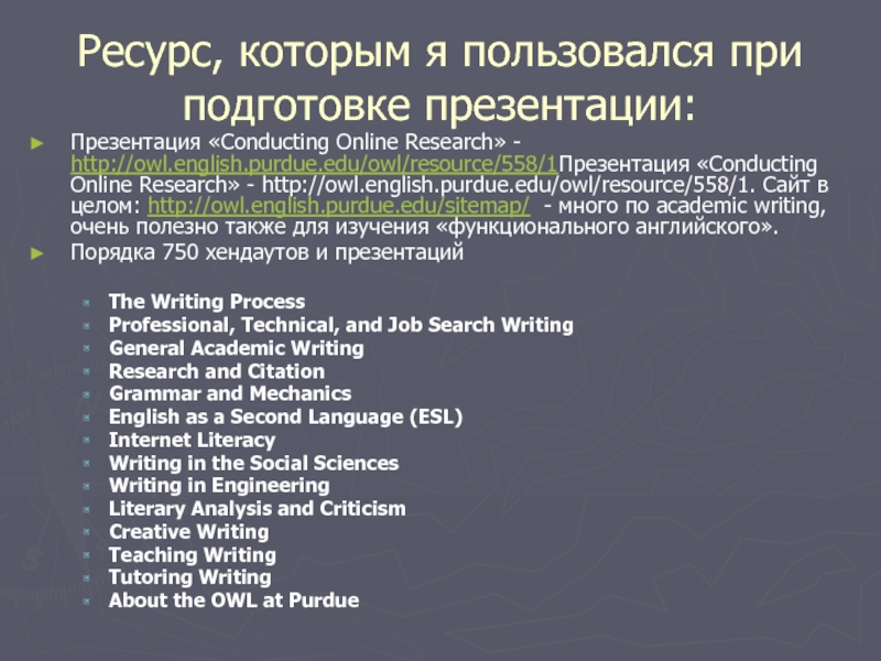 http://owl.english.purdue.edu/owl/resource/558/1Презентация «Conducting Online Research» - http://owl.english.purdue.edu/owl/resource/558/1. Сайт в целом: http://owl.english.purdue.edu/sitemap/ - много по academic writing, очень полезно также для изучения «функционального английского».