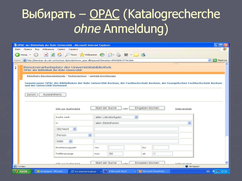 Слайд 17Выбирать – ОРАС (Katalogrecherche ohne Anmeldung)