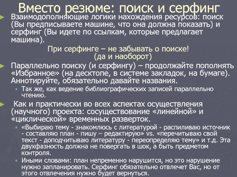 Иными словами: план непременно нарушится, но это нарушение нужно запланировать. Серфинг обязательно отвлечет Вас, но от этого отвлечения нужно будет вернуться.