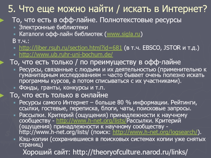 Ресурсы, связанные с людьми и их деятельностью (применительно к гуманитарным исследованиям – часто бывает очень полезно искать программы курсов, а потом списываться с их участниками).