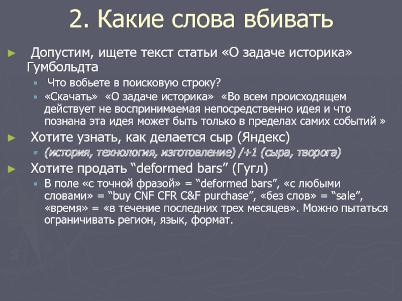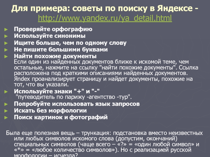 Слайд 10Для примера: советы по поиску в Яндексе - http://www.yandex.ru/ya_detail.html