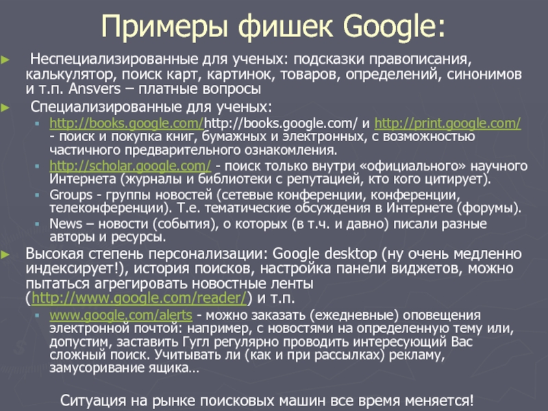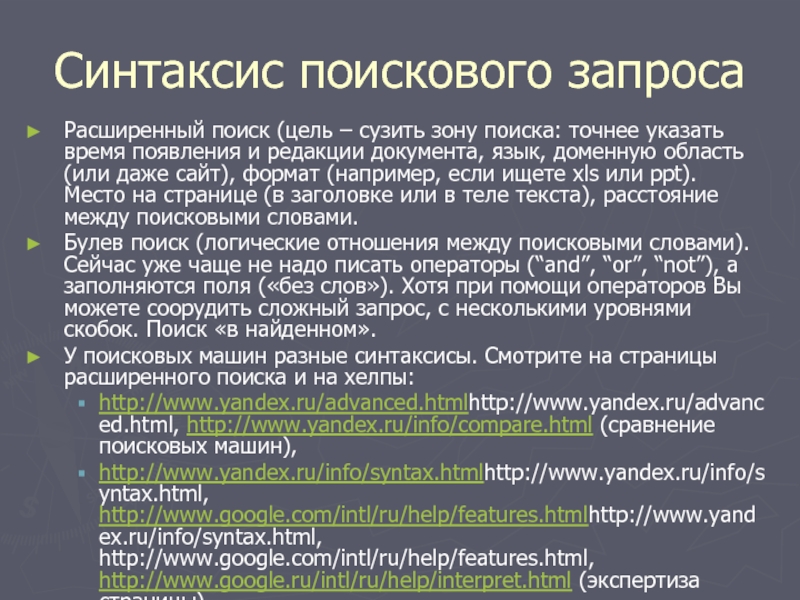 http://www.yandex.ru/info/syntax.htmlhttp://www.yandex.ru/info/syntax.html, http://www.google.com/intl/ru/help/features.htmlhttp://www.yandex.ru/info/syntax.html, http://www.google.com/intl/ru/help/features.html, http://www.google.ru/intl/ru/help/interpret.html (экспертиза страницы)