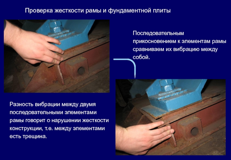 Разность вибрации между двумя последовательными элементами рамы говорит о нарушении жесткости конструкции, т.е. между элементами есть трещина.