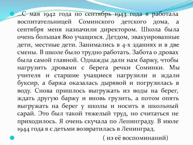 Соминского детского дома, а сентября меня назначили директором. Школа была очень большая 800 учащихся. Детдом, эвакуированные дети, местные дети. Занимались в 4-х зданиях и в две смены. В школе было трудно работать. Забота о дровах была самой главной. Однажды дали нам баржу, чтобы нагрузить дровами с берега речки Соминки. Мы учителя и старшие учащиеся нагрузили и ждали буксир, а баржа оказалась дырявой и погрузилась в воду. Снова пришлось выгружать из воды на берег, ждать другую баржу и вновь грузить, а потом опять выгружать на берег у школы и носить в школьный сарай. Это был такой тяжелый труд, но считаться не приходилось. Я очень скучала по Ленинграду. В июле 1944 года я с детьми возвратилась в Ленинград.