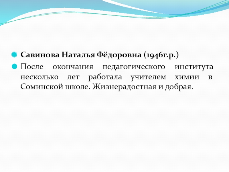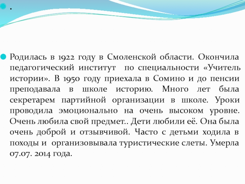 специальности «Учитель истории». В 1950 году приехала в Сомино и до пенсии преподавала в школе историю. Много лет была секретарем партийной организации в школе. Уроки проводила эмоционально на очень высоком уровне. Очень любила свой предмет.. Дети любили её. Она была очень доброй и отзывчивой. Часто с детьми ходила в походы и организовывала туристические слеты. Умерла 07.07. 2014 года.
