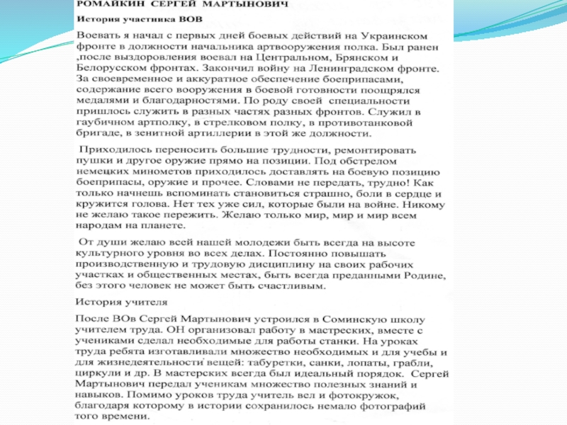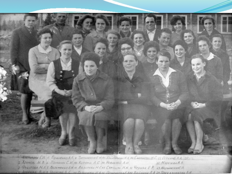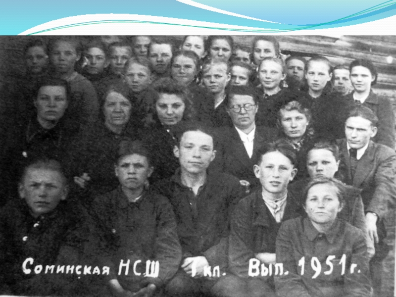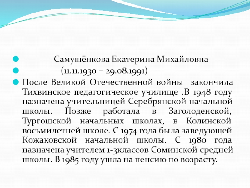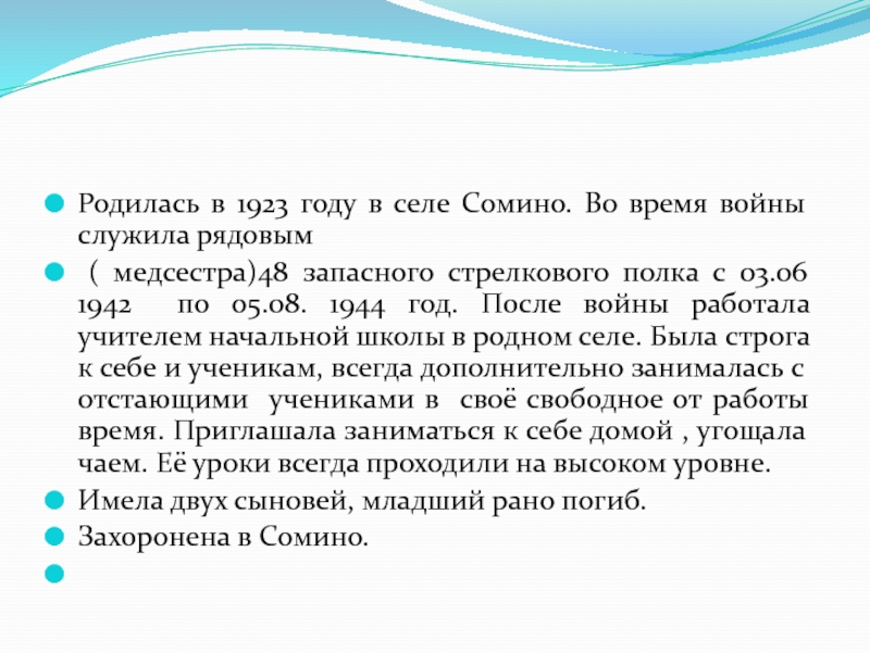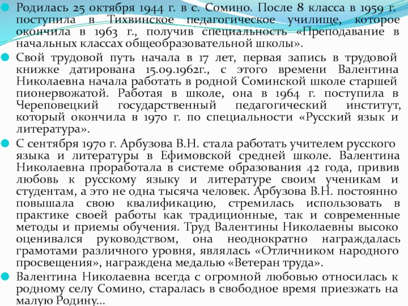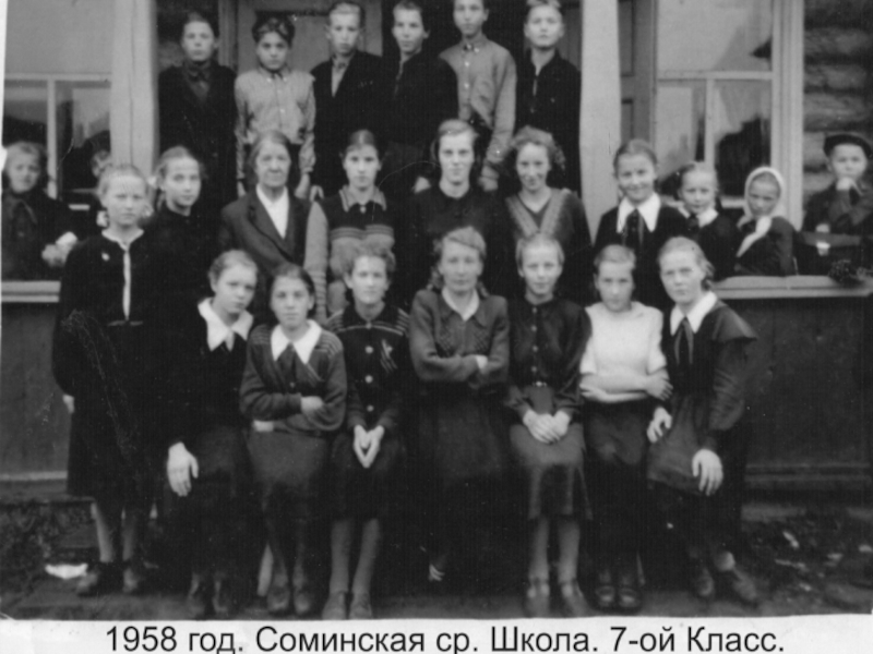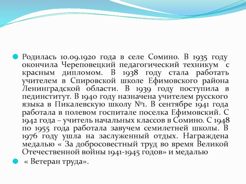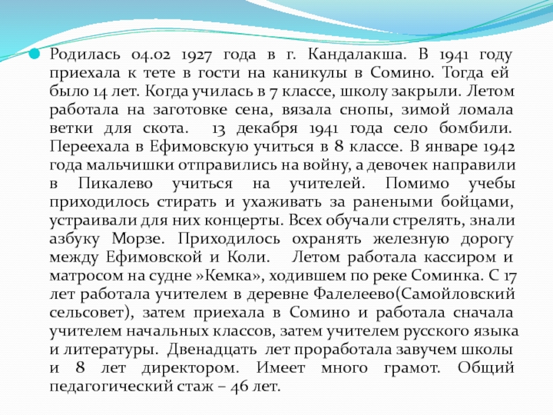 к тете в гости на каникулы в Сомино. Тогда ей было 14 лет. Когда училась в 7 классе, школу закрыли. Летом работала на заготовке сена, вязала снопы, зимой ломала ветки для скота. 13 декабря 1941 года село бомбили. Переехала в Ефимовскую учиться в 8 классе. В январе 1942 года мальчишки отправились на войну, а девочек направили в Пикалево учиться на учителей. Помимо учебы приходилось стирать и ухаживать за ранеными бойцами, устраивали для них концерты. Всех обучали стрелять, знали азбуку Морзе. Приходилось охранять железную дорогу между Ефимовской и Коли. Летом работала кассиром и матросом на судне »Кемка», ходившем по реке Соминка. С 17 лет работала учителем в деревне Фалелеево(Самойловский сельсовет), затем приехала в Сомино и работала сначала учителем начальных классов, затем учителем русского языка и литературы. Двенадцать лет проработала завучем школы и 8 лет директором. Имеет много грамот. Общий педагогический стаж – 46 лет.