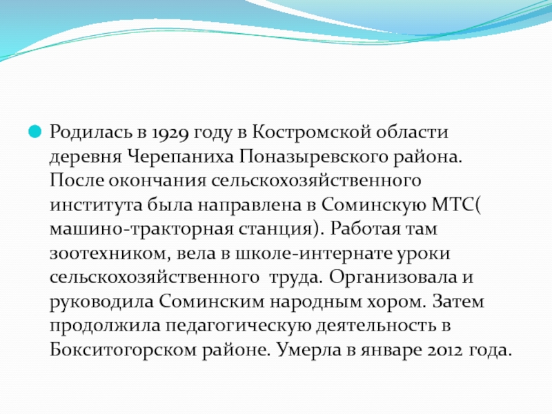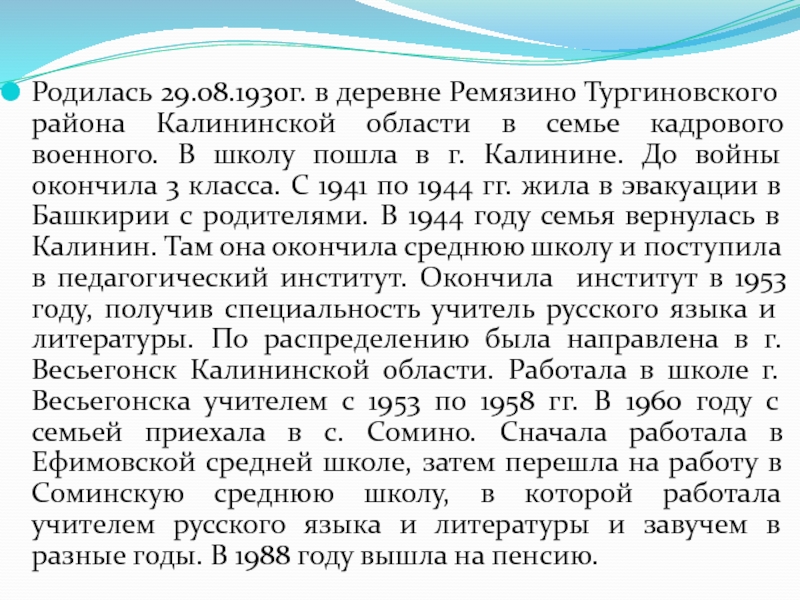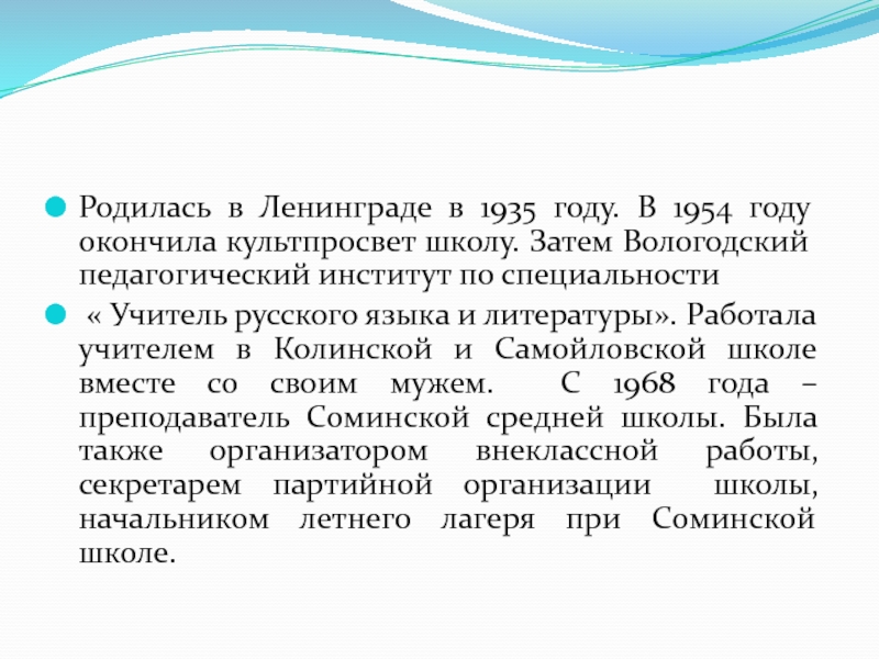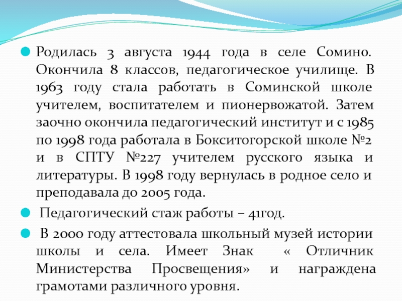 семье. Её мать родила в 50 лет. Она была восьмым ребёнком в семье. В 8 лет пошла учиться в Соминскую школу, была в одном классе с Нинель Сергеевной Лазаревой. Жила при школе в общежитии. Девочки сами топили печь и варили себе еду. В 1944году окончила школу и работала в деревне Озерёво на молокозаводе. В 1946 году уехала в Белоруссию к тете. Продолжила учёбу в вечерней школе, затем поступила в Педагогический институт в городе Витебске. А окончила институт уже в Ленинграде заочно. Один год работала учителем биологии и химии в Тургоши. Вышла замуж и с 1953 года работала учителем в Сомино. Она преподавала не только химию и биологию, но и вела пришкольный участок, который считался лучшим в районе.