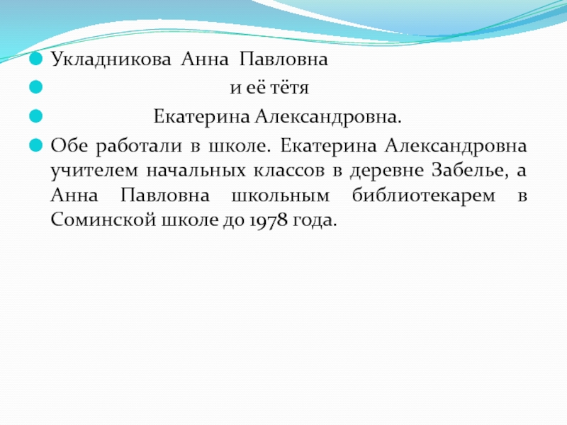 Обе работали в школе. Екатерина Александровна учителем начальных классов в деревне Забелье, а Анна Павловна школьным библиотекарем в Соминской школе до 1978 года.
