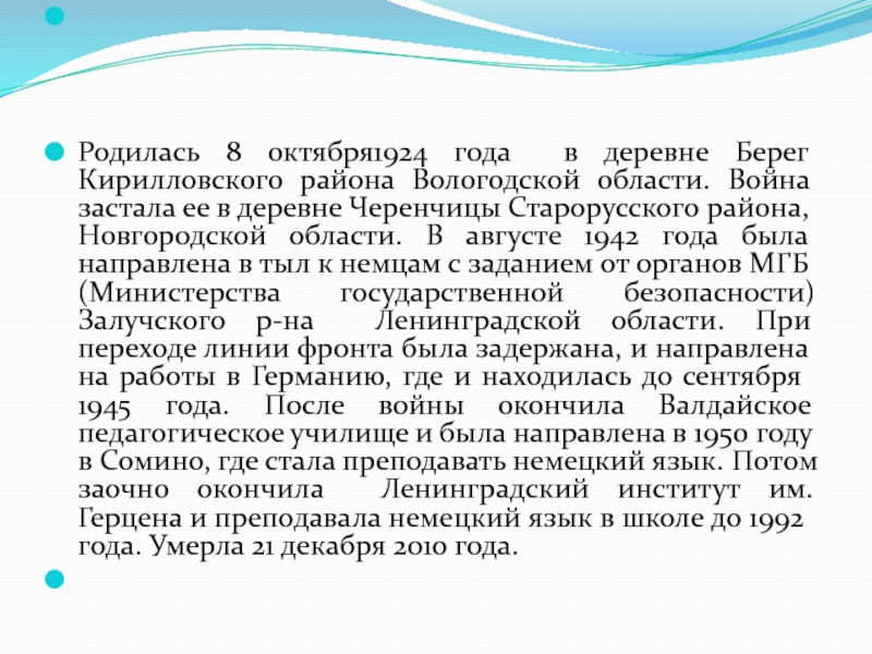 области. Война застала ее в деревне Черенчицы Старорусского района, Новгородской области. В августе 1942 года была направлена в тыл к немцам с заданием от органов МГБ (Министерства государственной безопасности) Залучского р-на Ленинградской области. При переходе линии фронта была задержана, и направлена на работы в Германию, где и находилась до сентября 1945 года. После войны окончила Валдайское педагогическое училище и была направлена в 1950 году в Сомино, где стала преподавать немецкий язык. Потом заочно окончила Ленинградский институт им. Герцена и преподавала немецкий язык в школе до 1992 года. Умерла 21 декабря 2010 года.