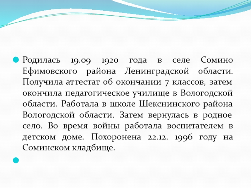 Родилась 19.09 1920 года в селе Сомино Ефимовского района Ленинградской области.