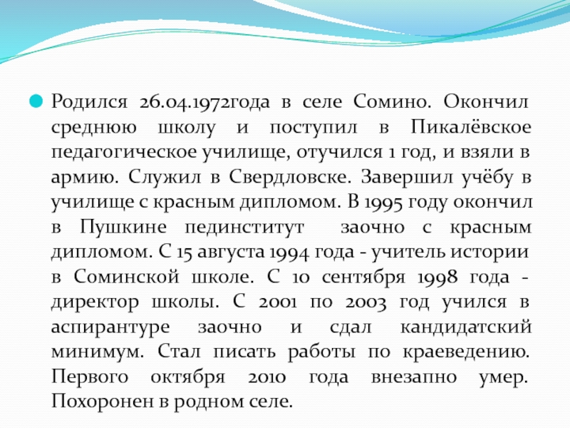 Родился 26.04.1972года в селе Сомино. Окончил среднюю школу и поступил в