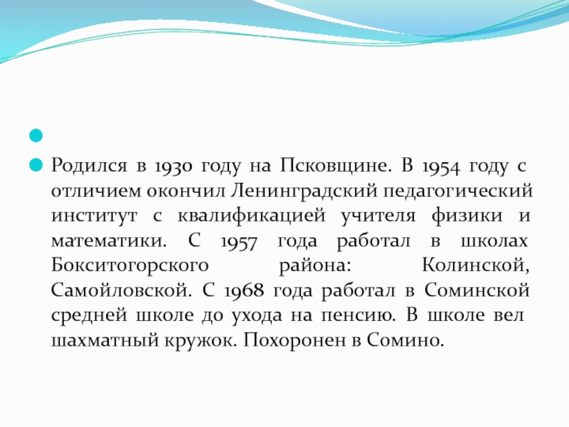 Всю войну работал бригадиром в колхозе »Искра». В 1947 году окончил среднюю школу, а затем Ленинградский педагогический институт, физико-математический факультет. Был делегатом первого Ленинградского областного съезда сельских учителей, депутатом 11 созывов, председателем административной комиссии. Преподавал в Соминской школе физику, математику, черчение.