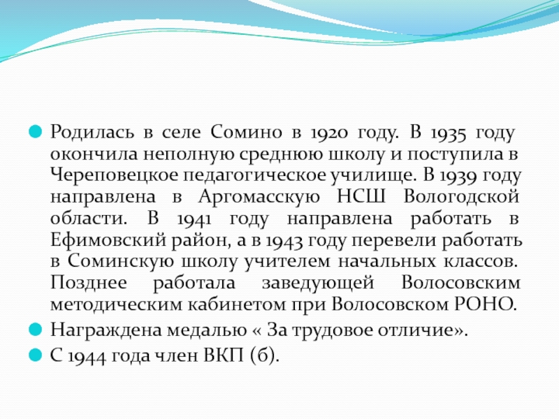 Родилась 10.09.1920 года в селе Сомино. В 1935 году окончила Череповецкий