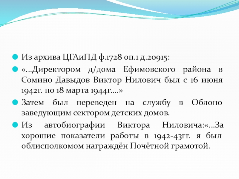 Давыдов Виктор Нилович был с 16 июня 1942г. по 18 марта 1944г….»