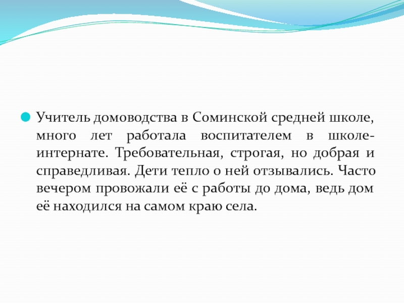 школе-интернате. Требовательная, строгая, но добрая и справедливая. Дети тепло о ней отзывались. Часто вечером провожали её с работы до дома, ведь дом её находился на самом краю села.