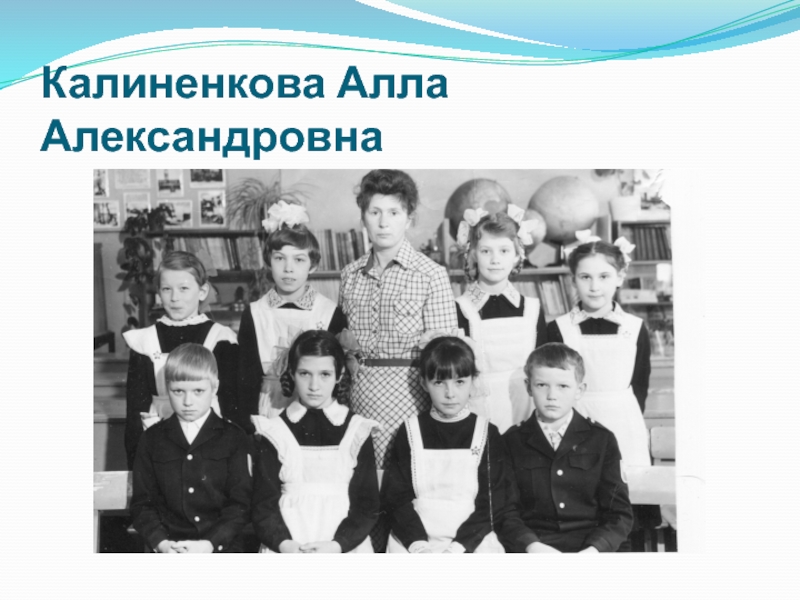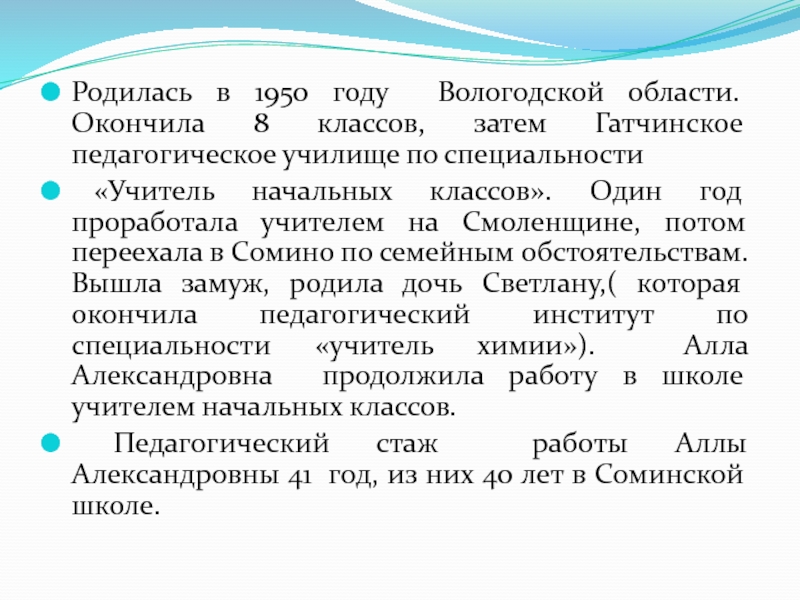 «Учитель начальных классов». Один год проработала учителем на Смоленщине, потом переехала в Сомино по семейным обстоятельствам. Вышла замуж, родила дочь Светлану,( которая окончила педагогический институт по специальности «учитель химии»). Алла Александровна продолжила работу в школе учителем начальных классов.