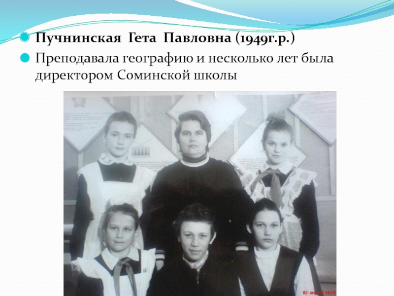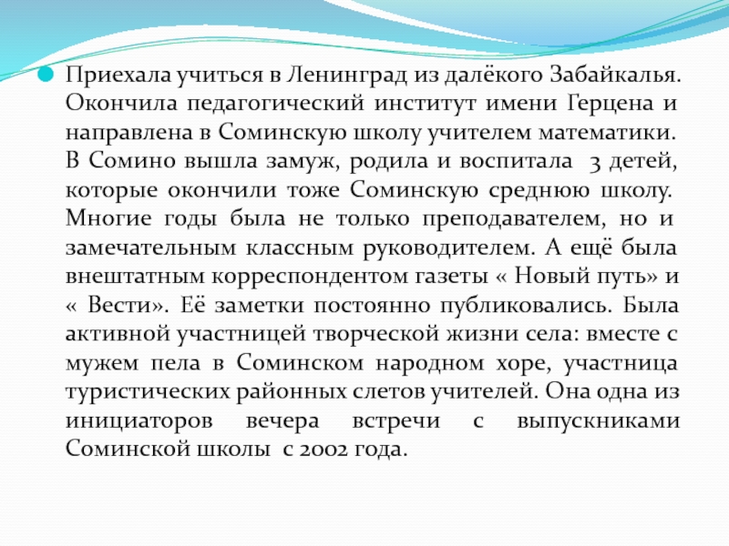 Герцена и направлена в Соминскую школу учителем математики. В Сомино вышла замуж, родила и воспитала 3 детей, которые окончили тоже Соминскую среднюю школу. Многие годы была не только преподавателем, но и замечательным классным руководителем. А ещё была внештатным корреспондентом газеты « Новый путь» и « Вести». Её заметки постоянно публиковались. Была активной участницей творческой жизни села: вместе с мужем пела в Соминском народном хоре, участница туристических районных слетов учителей. Она одна из инициаторов вечера встречи с выпускниками Соминской школы с 2002 года.