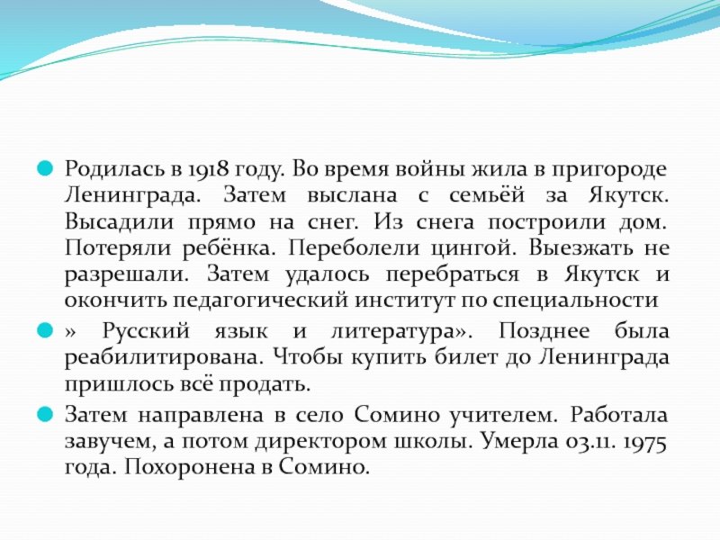 Затем выслана с семьёй за Якутск. Высадили прямо на снег. Из снега построили дом. Потеряли ребёнка. Переболели цингой. Выезжать не разрешали. Затем удалось перебраться в Якутск и окончить педагогический институт по специальности