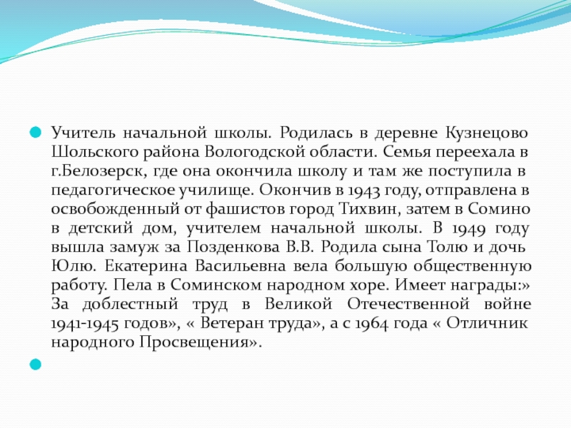 Учитель начальной школы. Родилась в деревне Кузнецово Шольского района Вологодской области.