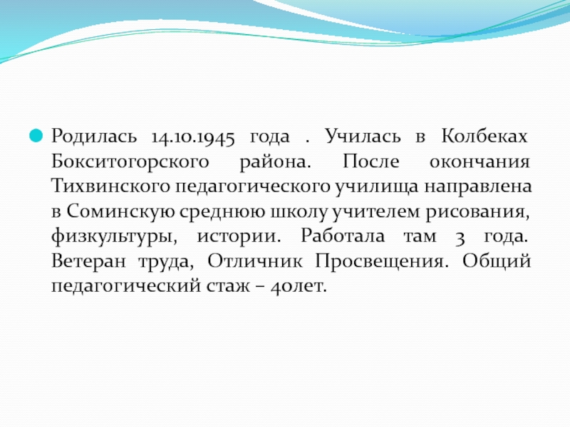 Родилась 14.10.1945 года . Училась в Колбеках Бокситогорского района. После окончания