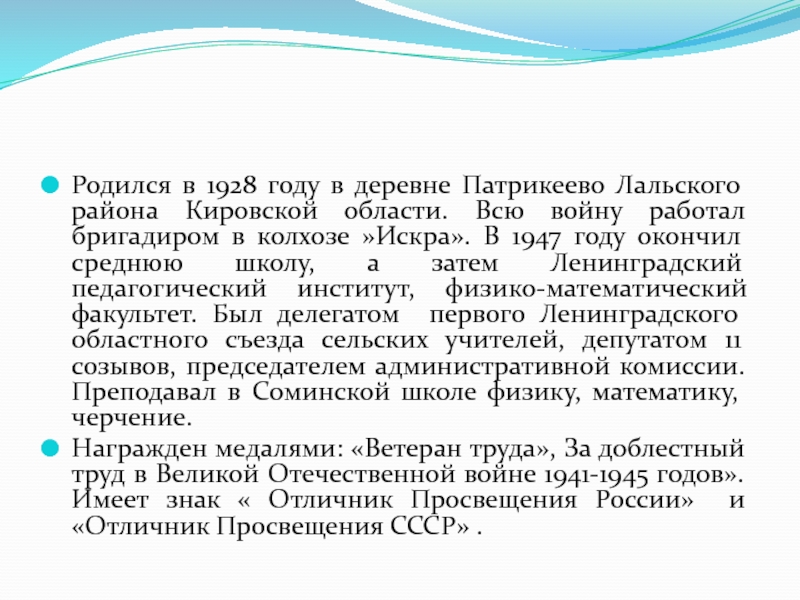 Родился в 1928 году в деревне Патрикеево Лальского района Кировской области.