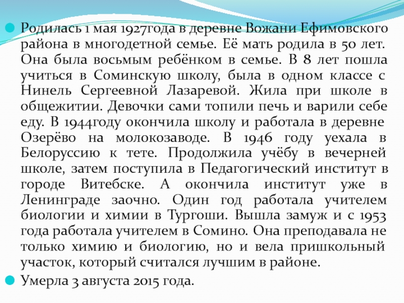 Родилась 1 мая 1927года в деревне Вожани Ефимовского района в многодетной