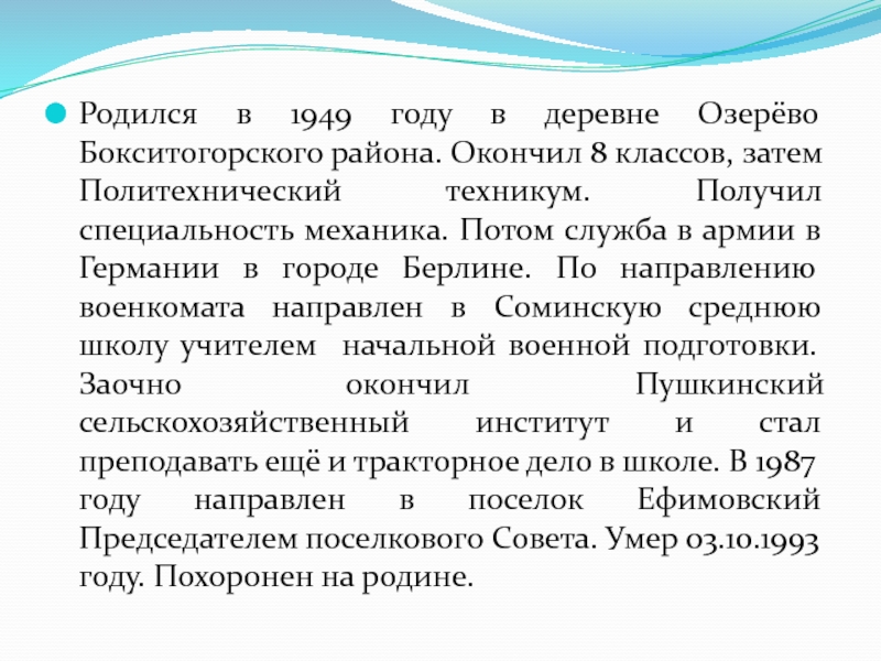классов, затем Политехнический техникум. Получил специальность механика. Потом служба в армии в Германии в городе Берлине. По направлению военкомата направлен в Соминскую среднюю школу учителем начальной военной подготовки. Заочно окончил Пушкинский сельскохозяйственный институт и стал преподавать ещё и тракторное дело в школе. В 1987 году направлен в поселок Ефимовский Председателем поселкового Совета. Умер 03.10.1993 году. Похоронен на родине.