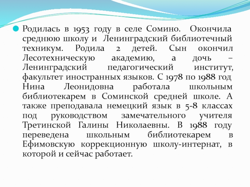 Ленинградский библиотечный техникум. Родила 2 детей. Сын окончил Лесотехническую академию, а дочь – Ленинградский педагогический институт, факультет иностранных языков. С 1978 по 1988 год Нина Леонидовна работала школьным библиотекарем в Соминской средней школе. А также преподавала немецкий язык в 5-8 классах под руководством замечательного учителя Третинской Галины Николаевны. В 1988 году переведена школьным библиотекарем в Ефимовскую коррекционную школу-интернат, в которой и сейчас работает.