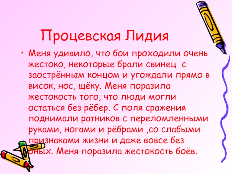 с заострённым концом и угождали прямо в висок, нос, щёку. Меня поразила жестокость того, что люди могли остаться без рёбер. С поля сражения поднимали ратников с переломленными руками, ногами и рёбрами ,со слабыми признаками жизни и даже вовсе без оных. Меня поразила жестокость боёв.