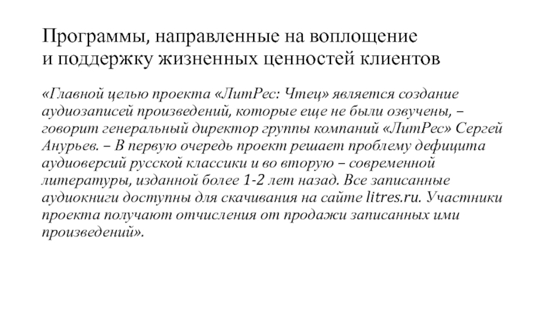 «ЛитРес: Чтец» является создание аудиозаписей произведений, которые еще не были озвучены, – говорит генеральный директор группы компаний «ЛитРес» Сергей Анурьев. – В первую очередь проект решает проблему дефицита аудиоверсий русской классики и во вторую – современной литературы, изданной более 1-2 лет назад. Все записанные аудиокниги доступны для скачивания на сайте litres.ru. Участники проекта получают отчисления от продажи записанных ими произведений».