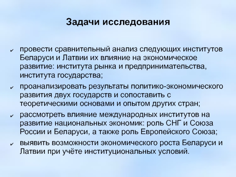 выявить возможности экономического роста Беларуси и Латвии при учёте институциональных условий.
