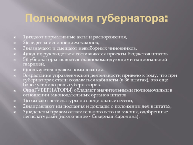 3)наделены правом отлагательного вето на законы, одобренные легислатурами (исключение - Северная Каролина).