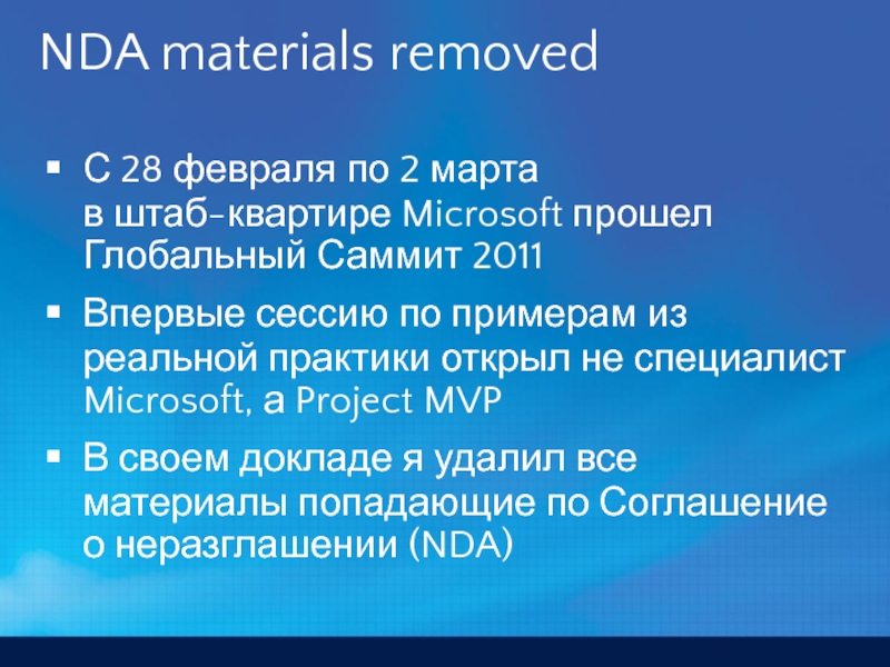 В своем докладе я удалил все материалы попадающие по Соглашение о неразглашении (NDA)