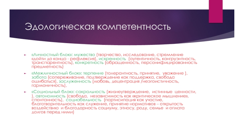 «Межличностный блок»: терпение (толерантность, принятие, уважение ), забота (сопереживание, подтверждение как поддержка, свобода ошибаться), заслуженность (любовь, децентрация /неэгоистичность, гармоничность),