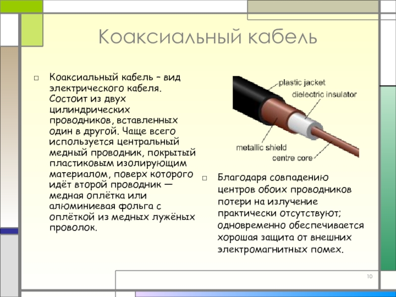 Слайд 10Коаксиальный кабель