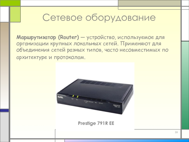 Слайд 26Маршрутизатор (Router) — устройство, используемое для организации крупных локальных сетей. Применяют
