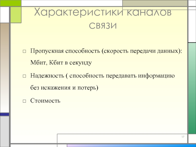 Слайд 17Характеристики каналов связи