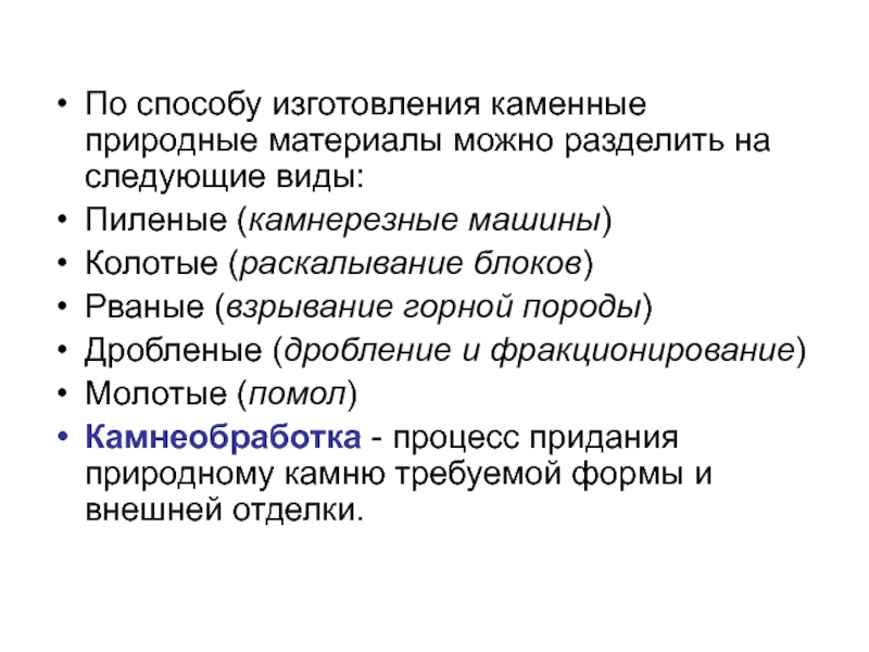 По способу изготовления каменные природные материалы можно разделить на следующие виды: