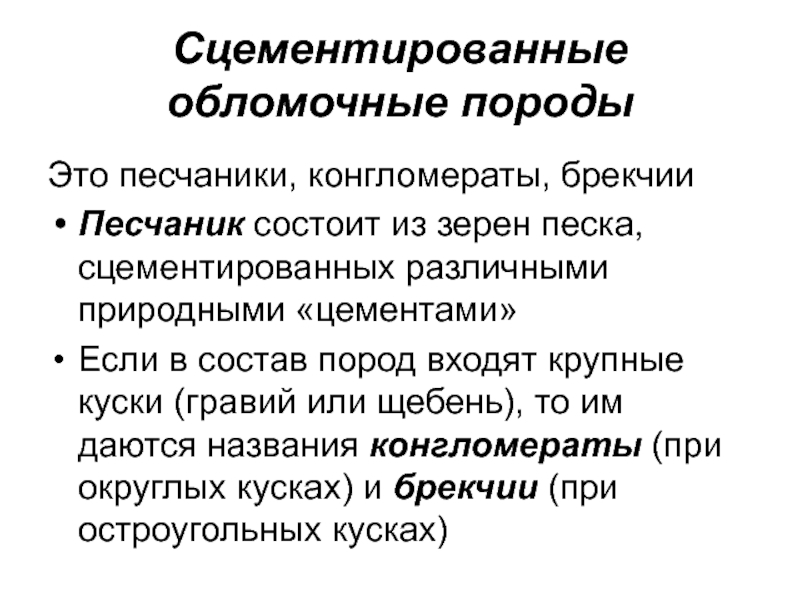 Если в состав пород входят крупные куски (гравий или щебень), то им даются названия конгломераты (при округлых кусках) и брекчии (при остроугольных кусках)