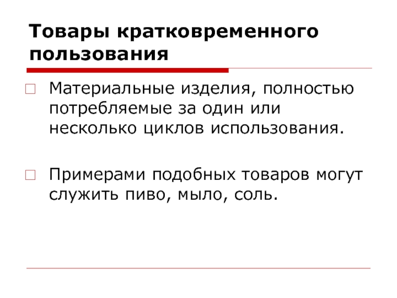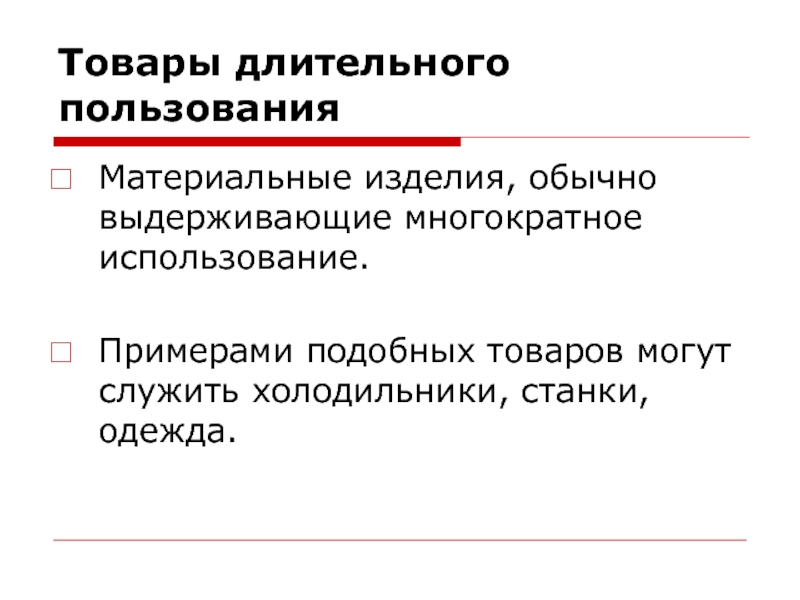 Примерами подобных товаров могут служить мебель, одежда, подержанные автомобили и основные электробытовые приборы.